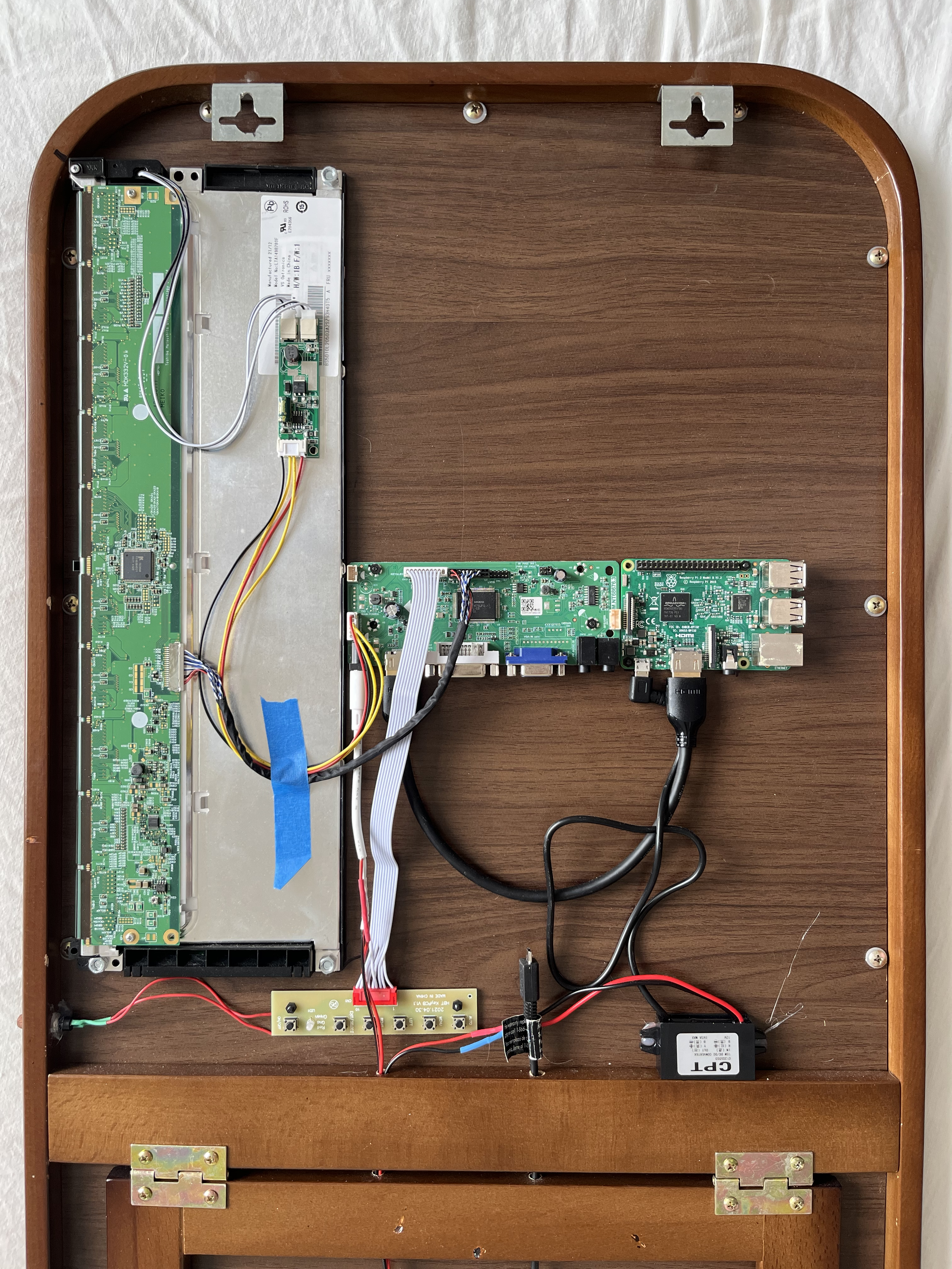 I found the VSDisplay screen on Amazon, which seemed perfect for what I wanted – something long and skinny that I’d be able to keep to the side. In order to get it to fit on the back of the mirror and not be so bulky as to prevent hanging the mirror against the wall, I took the electronics out of the enclosure.